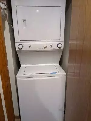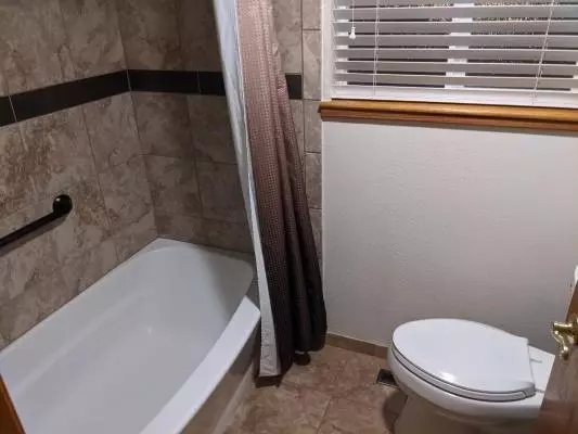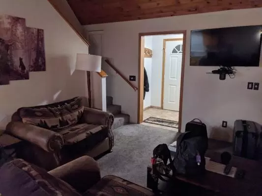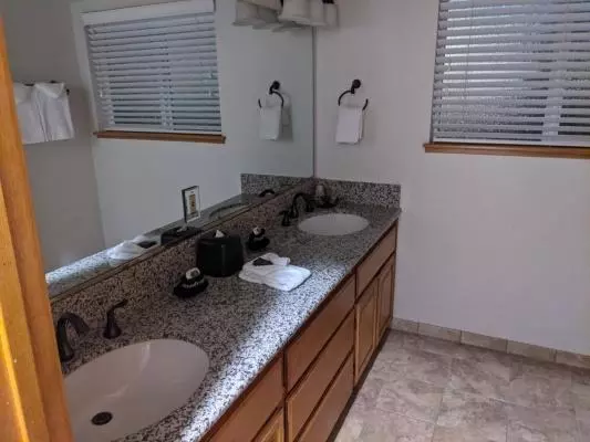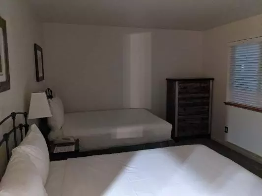 The cabin sleeps six. One bedroom has a king bed, one bedroom has two full size beds, the living room has a queen sofa bed. There are two bathrooms (one shower/tub combo and one oval jetted tub/shower combo), washer/dryer, full kitchen, fireplace, dining area with four bar stools and dining table for six. 1,200 sq ft.
